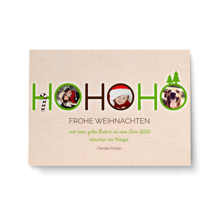 Die Weihnachtskarte HoHoHo in Grün ist nicht nur aufgrund der Farbwahl wirklich außergewöhnlich. Auch die Idee, die Fotofelder in die Schrift zu integrieren, ist modern, pfiffig und absolut neu. Mit dieser Karte erregt man garantiert Aufmerksamkeit und bleibt in Erinnerung.