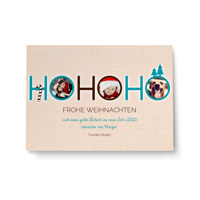Um bei all der Weihnachtspost überhaupt noch aufzufallen muss man sich schon etwas einfallen lassen - so wie die Weihnachtskarte HoHoHo in Türkis. Eine komplett moderne Optik, freundliche, helle Farben und die Integration von Fotos in die Schrift wirken charmant und bleiben garantiert im Gedächtnis.