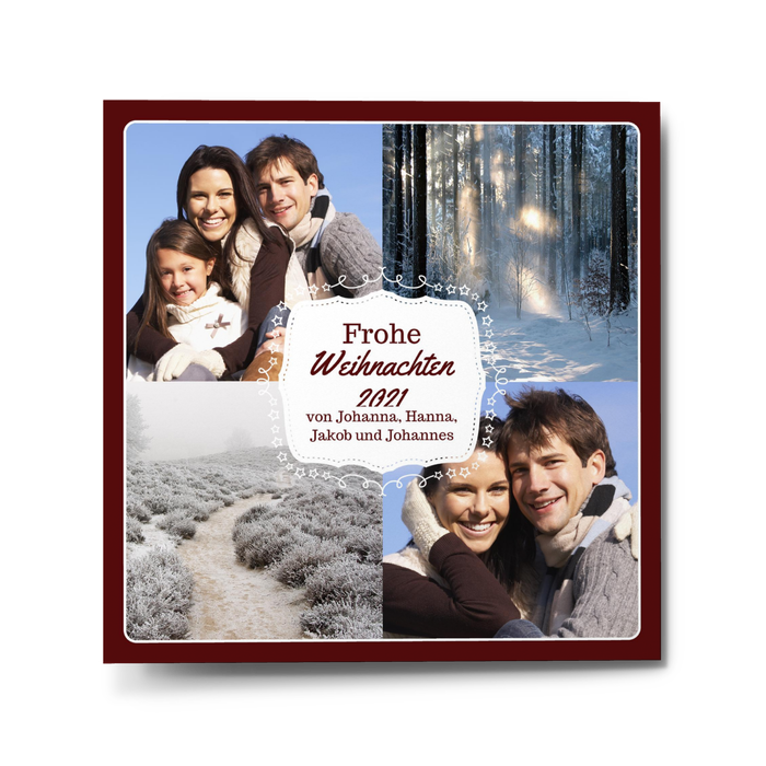 Wer auf der Suche nach einer modernen Weihnachtskarte ist, der hat mit diesem Weihnachtsschild in Rot genau die passende Karte gefunden. Große Foto- und Textflächen geben Ihnen die Möglichkeit Ihre Lieben mit ganz persönlichen Bildern und evtl. auch einigen Textzeilen zu grüßen.