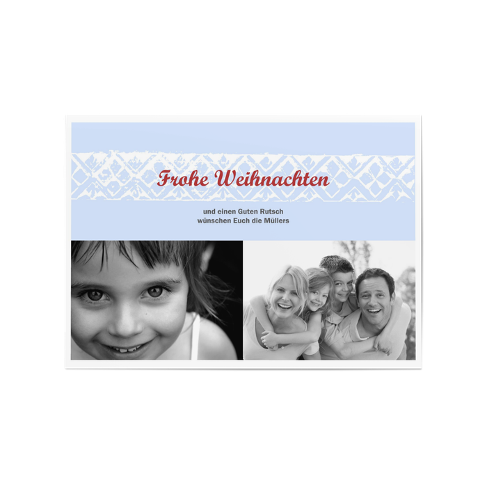 In winterlichem Hellblau gehalten stimmt diese Karte mit dem Norwegermuster Ihre Lieben auf die Feiertage ein. Fügen Sie Ihre persönlichen Fotos ein und wünschen Sie Ihren Lieben alles Gute zum Fest. Über diese selbstgestaltete Karte werden sich Freunde und Verwandte ganz besonders freuen. Merry Christmas!